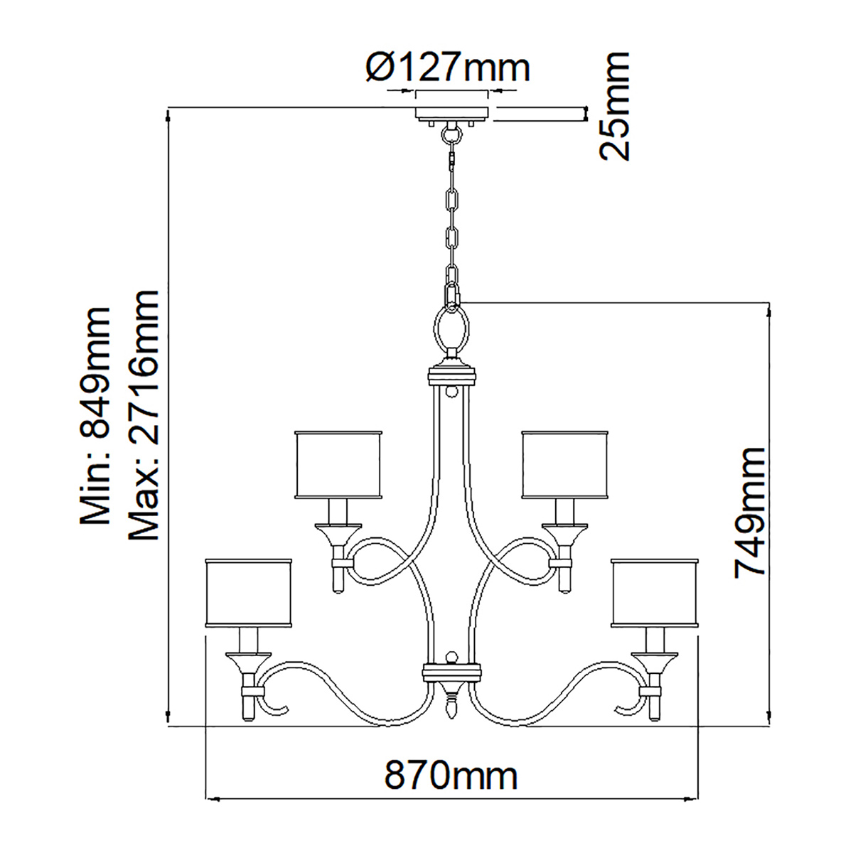 9 ламп - мин. длина - 84.9 см, макс. длина - 271.6 см. (Д87 х В74.9 см) Вес - 11.55 кг
