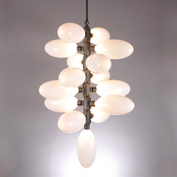 Каждая люстра состоит из большого количества плафонов нанизанных на алюминиевые подвижные позвонки. Что дает возможность видоизменять люстру, давать ей естественное ниспадание. Каждый плафон выдувается вручную - что дает особенное, в полном смысле этого слова, неповторимое,  изящество.