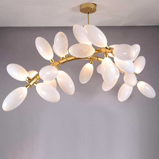 Каждая люстра состоит из большого количества плафонов нанизанных на алюминиевые подвижные позвонки. Что дает возможность видоизменять люстру, давать ей естественное ниспадание. Каждый плафон выдувается вручную - что дает особенное, в полном смысле этого слова, неповторимое,  изящество.