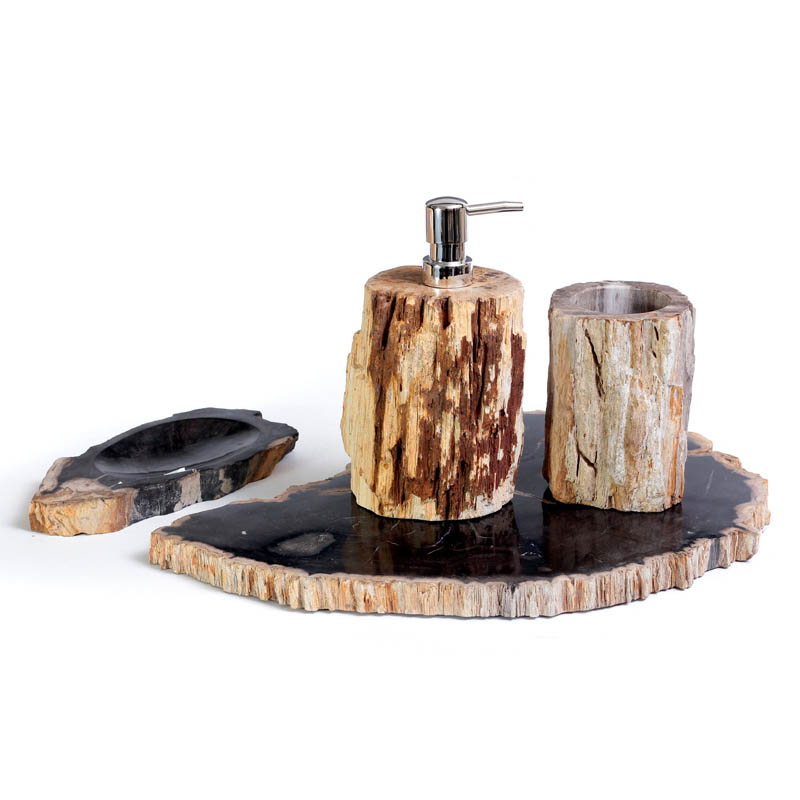 Набор аксессуаров для ванной из окаменелого дерева - поднос, дозатор мыла, мыльница, стакан. Страна происхождения: Индонезия.