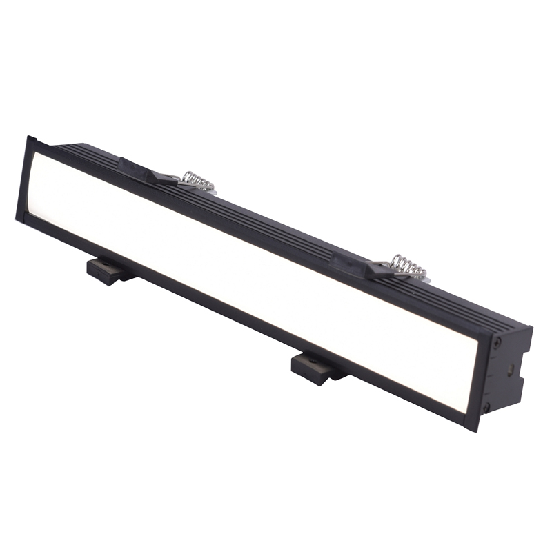 Врезной светильник, каркас черного цвета, рассеиватель из белого акрила.